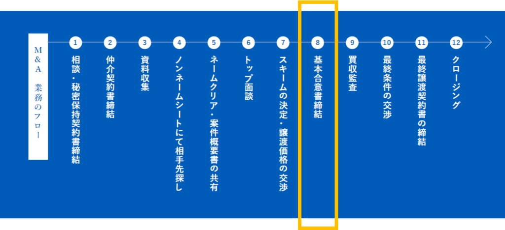 基本合意契約は下図のM&Aの流れの通り、トップ面談と内見を終えて、最終契約を締結する前のタイミングで締結することが多いです。役割としては、DD(買収監査)や最終契約など、外部の専門家に大きな費用が発生してからM&Aが不成立になる場合のリスクを軽減し(例えば、買い手が弁護士に法務DDを発注してから、売り手が別の買い手候補に売却してしまうなど)、また、最終締結までをスムーズに行うことなどを目的としています。