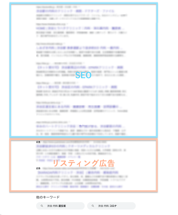 例えば、Googleで「渋谷 内科」と検索したとき、大きく3つの構成に分かれて検索結果が表示されます。まず、最上部に表示されているのが「広告」部分です。ここに表示をさせる広告手法を「リスティング広告」と呼びます。そして、2番目に地図とともにクリニックの情報が掲載されているのが「Googleビジネスプロフィール」であり、ここで上位表示させることをマップエンジン最適化の略で「MEO(Map Engine Optimization)」と言います。3番目に表示されているのが「一般検索」の部分であり、ここで上位表示させることを検索エンジン最適化の略で「SEO(Search Engine Optimization)」と言います。