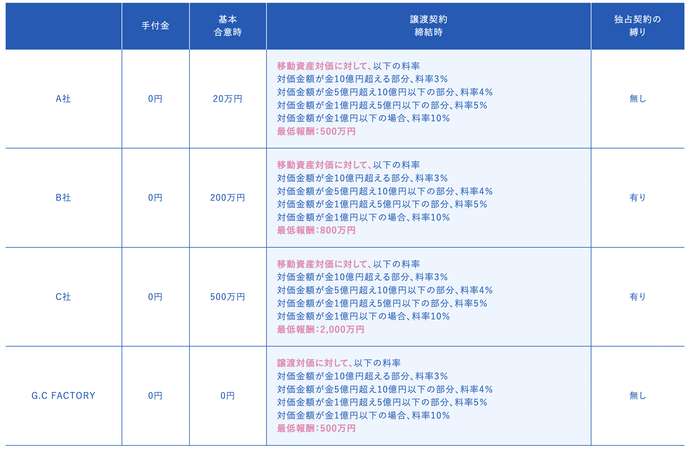 弊社の場合は、最低報酬は500万円です。例えば譲渡対価が6000万円の案件は、手数料600万円となり、譲渡対価が4000万円の案件は500万円となります。