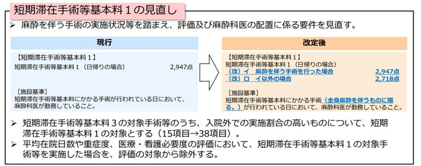 日帰り手術について、短期滞在手術等基本料1の算定条件として、全身麻酔を伴う手術以外は麻酔科医が勤務していなくても算定が可能になりました。