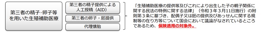 しかし、第三者提供の精子・卵子等を用いた生殖補助医療など、保険適用されない技術もあります。現在、不妊治療について保険診療と保険外診療の併用を検討していますが、原則は「保険適用されない治療が含まれる場合、一連の治療が全て保険外治療となる」ため、場合によっては患者の負担額が増加してしまう恐れもあり、注意が必要です。